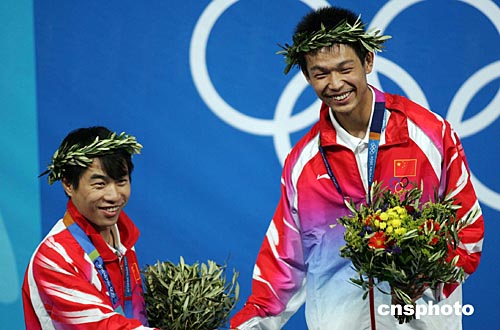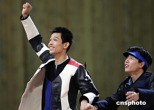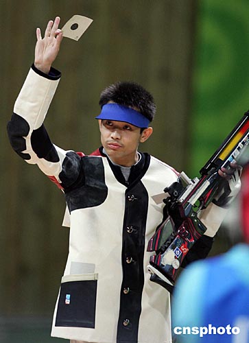 當(dāng)?shù)貢r間八月十六日,中國選手朱啟南(左)與李杰在雅典奧運男子十米氣步槍射擊比賽中分獲金、銀牌。朱啟南并以七百零二環(huán)的成績打破世界紀(jì)錄。中新社記者:毛建軍