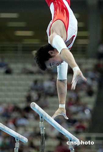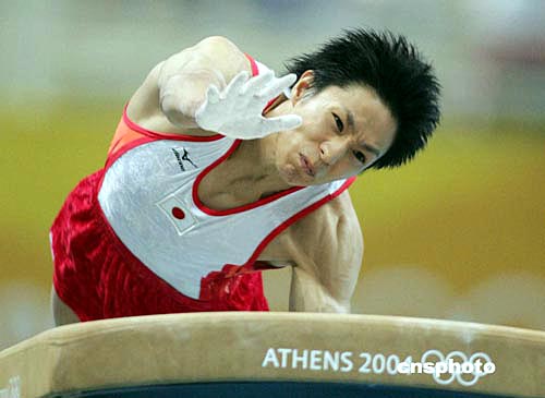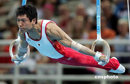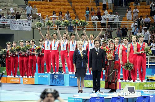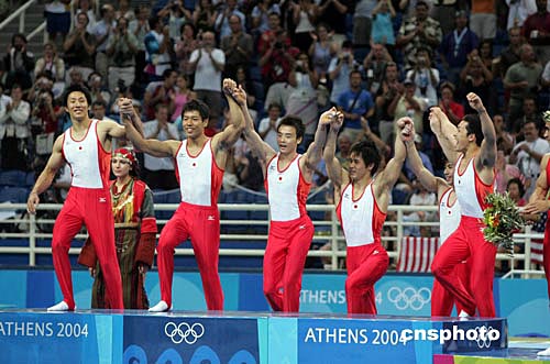 當(dāng)?shù)貢r(shí)間八月十六日晚,日本隊(duì)在雅典奧運(yùn)男子體操團(tuán)體比賽中獲得金牌。中新社記者:毛建軍