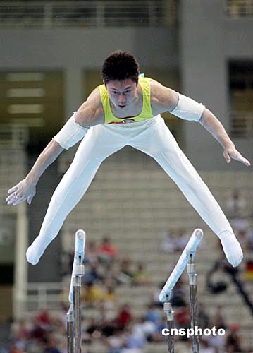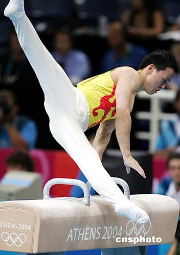 當(dāng)?shù)貢r(shí)間八月十六日晚,雅典奧運(yùn)男子體操團(tuán)體比賽在奧運(yùn)體操比賽館舉行,中國(guó)隊(duì)衛(wèi)冕失利,僅獲得第五名。中新社記者:毛建軍