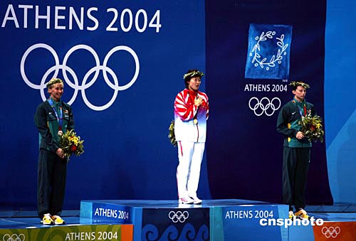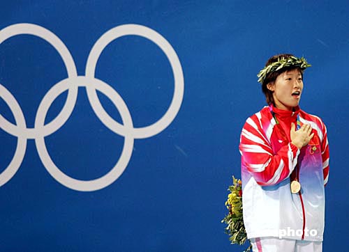 參加雅典奧運會游泳比賽的中國選手極少擁有問鼎獎牌實力者,羅雪娟在當?shù)貢r間八月十六日晚奇跡般奪得女子一百米蛙泳金牌。這是她登上領(lǐng)獎臺最高層,頭戴橄欖桂冠,面對冉冉升起的中國國旗激動得和唱著國歌。中新社記者:任晨鳴