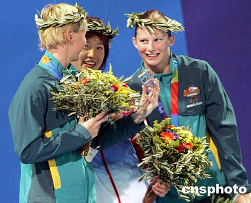中國(guó)選手羅雪娟,雅典當(dāng)?shù)貢r(shí)間八月十六日晚奇跡般奪得第二十八屆奧運(yùn)會(huì)女子一百米蛙泳金牌。這是她在冠軍領(lǐng)獎(jiǎng)臺(tái)上,頭戴橄欖桂冠,接受獲得第二、第三名的澳大利亞選手祝賀。中新社記者:任晨鳴
