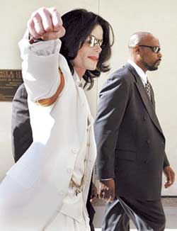 杰克遜這次身著的三件套裝全部為白色,另外他還戴了一個金色的袖標(biāo)以及腳蹬一雙亮閃閃的白色靴子。他乘坐一輛金色的加長房車抵達法庭門口,下車時受到了100多個大聲尖叫的歌迷的歡迎。