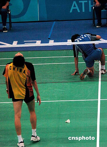 中國(guó)羽球選手鮑春來(lái)與韓國(guó)樸泰相在激烈對(duì)抗后均認(rèn)為自己失手而雙雙長(zhǎng)嘆。后裁判認(rèn)定該球韓國(guó)選手勝。最終結(jié)果是鮑春來(lái)被淘汰。作者:陳佳