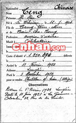 卡片的主要內(nèi)容為———國籍:中國;姓名:鄧希賢;出生:四川,1904年7月12日(中國農(nóng)歷———編者注);父親:鄧文明;職業(yè):工廠工人;婚姻狀況:未婚;身份卡號碼:1·250·349;到達(dá)日期:1922年2月13日;居住地點:leangle;離開時間:1922年11月3日;目的地:賽納-夏狄戎中學(xué);備注:1923年2月1日重返leangle;1923年6月11日離去,前往拉加雷納-科隆市的德拉普安特街39號。