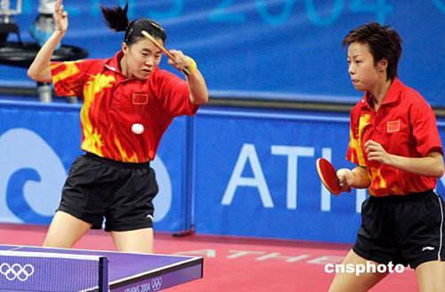 當(dāng)?shù)貢r間八月十八日,在雅典奧運(yùn)會乒乓球女雙1/4決賽中,王楠、張怡寧以4:2淘汰中國香港選手桑亞蟬、帖亞娜,率先晉級半決賽。中新社記者:張煒