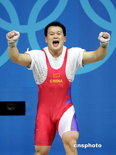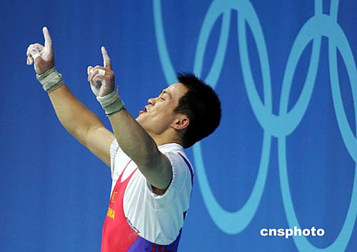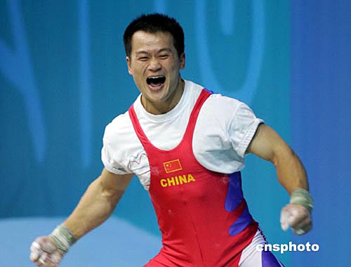 希臘當(dāng)?shù)貢r(shí)間八月十八日晚,中國(guó)舉重選手張國(guó)政在雅典奧運(yùn)男子六十九公斤級(jí)舉重比賽中,以三百四十七點(diǎn)五公斤的總成績(jī)獲得冠軍,為中國(guó)代表團(tuán)“舉起”第十一枚金牌。作者:毛建軍