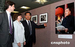 美東時(shí)間八月十八日傍晚,由中國常駐聯(lián)合國代表團(tuán)主辦的《紀(jì)念鄧小平誕辰一百周年照片展》在紐約聯(lián)合國總部隆重開幕。本展覽為期十天,展出圖片收取了鄧小平從少年到晚年的近五十個(gè)重要片段。圖為中國代理常駐聯(lián)合國代表張義山(右)向聯(lián)合國副秘書長貝蒂尼(中)和英國常駐聯(lián)合國副代表艾登斯(左)介紹展覽情況。作者:龔文謨