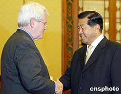 中新社北京八月十九日電(記者 邢利宇)中共中央政治局常委、全國政協(xié)主席賈慶林今天下午在人民大會堂會見了以美國前眾議院議長紐特·金里奇率領(lǐng)的美國對外政策理事會代表團(tuán)。