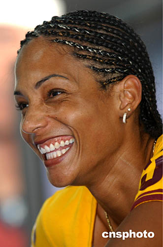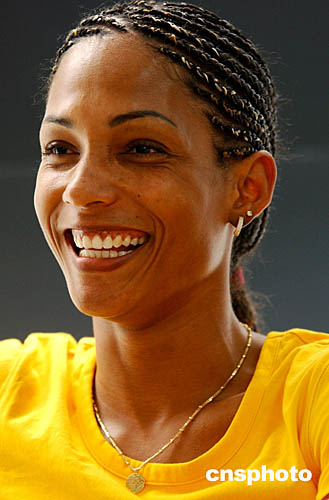 圖為法國賽跑選手Christine Arron在當(dāng)?shù)貢r(shí)間8月18日舉行新聞發(fā)布會(huì)時(shí)露出燦爛的笑容。她將在下周參加女子100米,200米和4*100米接力比賽。