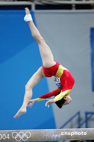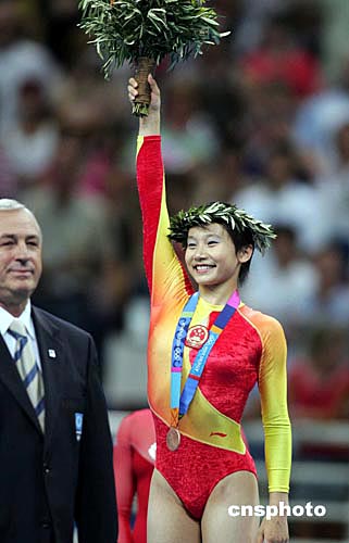 當?shù)貢r間八月十九日晚,中國體操選手張楠獲得雅典奧運女子體操全能銅牌。中新社記者:毛建軍