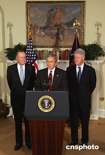 據(jù)美國白宮發(fā)言人麥克米蘭介紹,布什的父親老布什以及前總統(tǒng)克林頓,將會通過媒體采訪以及巡游全國的方式為海嘯災(zāi)民募捐。他們同時也會利用各自的“關(guān)系網(wǎng)絡(luò)”說服公司、基金會以及富人進(jìn)行募捐。