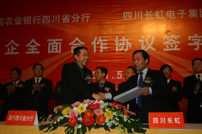 中新四川網(wǎng)1月5日電(記者肖龍聯(lián))中國農(nóng)業(yè)銀行四川省分行與四川長虹電子集團有限公司今天上午在成都錦江賓館舉行銀企全面合作簽約儀式,農(nóng)行將為長虹提供綜合授信三十億元人民幣,以幫助長虹克服反傾銷帶來的不利影響,支持長虹集團新一屆領(lǐng)導(dǎo)人確立的多元化、國際化發(fā)展戰(zhàn)略的實施。