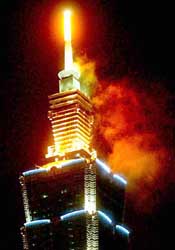 據(jù)臺(tái)“中國(guó)時(shí)報(bào)”報(bào)道,6日晚間7點(diǎn),臺(tái)北消防人員接報(bào)101大樓89層處有大量白煙冒出,但經(jīng)他們到現(xiàn)場(chǎng)察看后,研判可能只是純粹云層飄過造成的錯(cuò)覺而已。但這幅畫面也意外形成一幅臺(tái)北101有趣的景像。