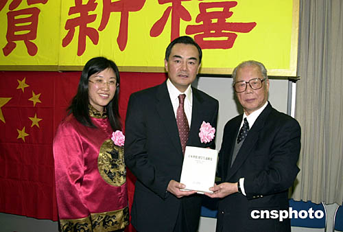 歷經(jīng)十五年編纂而成的六十萬(wàn)字的僑史力作《日本華僑·留學(xué)生運(yùn)動(dòng)史》,日前在東京出版面世。這本凝聚日本僑界心血的歷史專著,填補(bǔ)了在日華僑和留學(xué)生史料的大量空白,獲得各界高度評(píng)價(jià)。圖為該書主編、著名僑領(lǐng)陳焜旺先生(圖右),在八日于東京舉行的日本僑界迎新聯(lián)歡會(huì)上,向王毅大使(圖中)和中國(guó)駐日本大使館總領(lǐng)事于淑媛(圖左)贈(zèng)送該書。作者:王健