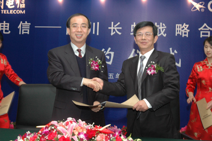 中新網(wǎng)1月11日電 (陳紅)中國電信集團(tuán)和四川長虹集團(tuán)戰(zhàn)略合作備忘錄簽字儀式昨天在北京舉行。中國電信集團(tuán)公司副總經(jīng)理冷榮泉和四川長虹董事長趙勇代表雙方簽署了《中國電信——四川長虹戰(zhàn)略合作備忘錄》。信息產(chǎn)業(yè)部副部長婁勤儉、四川省副省長楊志文、中國電信集團(tuán)公司總經(jīng)理王曉初等也出席了簽字儀式。中國電信和四川長虹將在終端設(shè)備及渠道領(lǐng)域結(jié)成戰(zhàn)略合作伙伴,此次通信和家電巨頭強(qiáng)強(qiáng)聯(lián)手,標(biāo)志著中國3C融合從概念形成到產(chǎn)業(yè)推進(jìn)邁出實(shí)質(zhì)性的一步,同時(shí)也將有力地推動(dòng)雙方戰(zhàn)略轉(zhuǎn)型工作的深入開展。