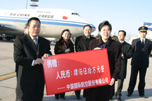 中國(guó)國(guó)航股份公司董事長(zhǎng)李家祥在此間表示:印度洋海嘯造成的巨大災(zāi)難,牽動(dòng)著中國(guó)人民的心,也牽動(dòng)著國(guó)航職工的心。當(dāng)中國(guó)紅十字總會(huì)向國(guó)航提出運(yùn)輸緊急救災(zāi)物資的要求后,在運(yùn)力十分緊張的情況下,中國(guó)國(guó)航取消了十九日的CA9003正常航班,將本架747-200型飛機(jī)專門用于紅十字救災(zāi)物資的承運(yùn),國(guó)航為此捐出運(yùn)輸費(fèi)用達(dá)四百五十萬(wàn)元。
