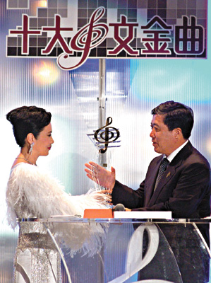 在昨晚頒獎禮中,各女歌手不乏性感打扮,容祖兒好像圍了一個胸圍在胸前,而楊千鏵也不弱,雖然穿著西裝外套,但內里卻是低V衫,新人官恩娜也十分性感。另外,昨晚原定擔任司儀之一的陳百祥,因為突然腳部有事而缺席。