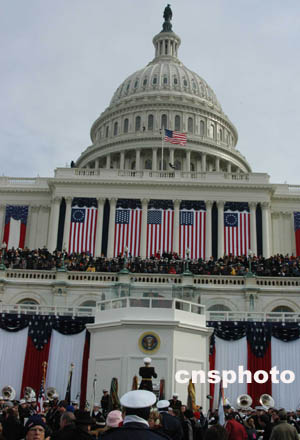 中新網(wǎng)華盛頓1月20日電(記者余東暉)在空前嚴(yán)格的保安下,獲得連任的布什二十日中午在美國(guó)國(guó)會(huì)大廈前宣誓就任第五十五屆美國(guó)總統(tǒng)。