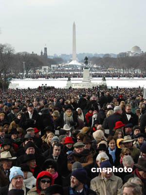當(dāng)天華盛頓雪后初晴,但天寒地凍,數(shù)十萬(wàn)人聚集在從國(guó)會(huì)山到華盛頓紀(jì)念碑的街道和草坪上,參加布什的就職典禮。他們當(dāng)中既有為布什連任歡呼者,也有不滿布什政府的抗議示威者。