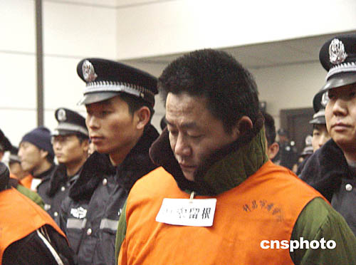 一月二十一日上午九時,河南許昌市中級人民法院對“中原涉黑第一案”——宋留根、馬獻洲、郝洪山特大涉黑團伙案,進行一審宣判。首犯宋留根以組織領導黑社會罪、故意殺人罪、故意傷害罪等八項罪名,被宣判執(zhí)行死刑,剝奪政治權利終身,并附帶民事訴訟,賠償原告人經(jīng)濟損失五萬元人民幣。圖為宋留根在法庭上。作者:胡珂