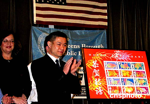 當?shù)貢r間一月二十一日,美國郵政局正式發(fā)行中國農(nóng)歷新年生肖郵票紀念版小全張,為從一九九二年開始在發(fā)行的美國中國生肖郵票畫上句號。圖為在華裔聚居的紐約法拉盛舉行的發(fā)行儀式。作者:趙海燕