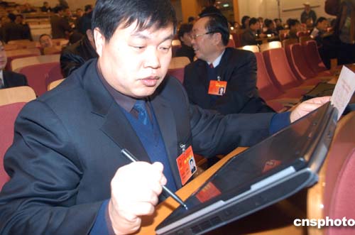 中國(guó)第一代程序員、來(lái)自石景山區(qū)的人大代表朱崇君使用電腦寫(xiě)各種建議。作者:張宇