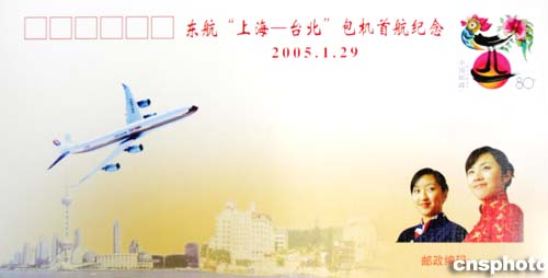 一月二十七日,中國(guó)東方航空股份有限公司特意制作了該公司“上海——臺(tái)北”臺(tái)商春節(jié)包機(jī)首航紀(jì)念信封,準(zhǔn)備贈(zèng)送給二十九日搭乘包機(jī)返鄉(xiāng)的臺(tái)胞旅客。作者:湯彥俊