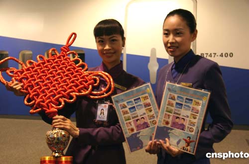 臺灣“華航”為此次首航北京春節(jié)包機活動,特別與桃園郵局合作設(shè)計了二OO五年“華航兩岸春節(jié)包機紀念郵票”。郵票中除了有“相逢自是有緣,華航以客為榮”的空服形象,另有五款“華航”目前機隊機型及此次春節(jié)包機航站圖等。它們將作為禮品贈與此次搭乘“華航”春節(jié)包機的旅客。作者:邢利宇