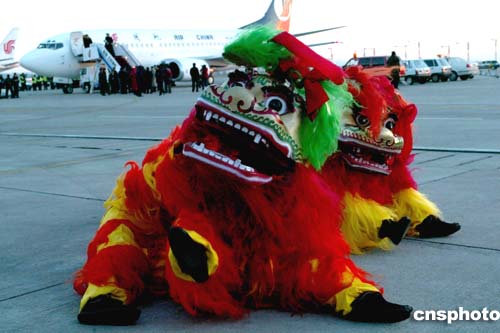 中國國際航空公司的CA1087/8航班一月二十九日上午七時(shí)四十六分從北京首都國際機(jī)場出發(fā)飛往臺(tái)北,這是五十六年來大陸民航班機(jī)首度飛往臺(tái)灣。圖為首航儀式上的舞獅表演。作者:滿會(huì)喬