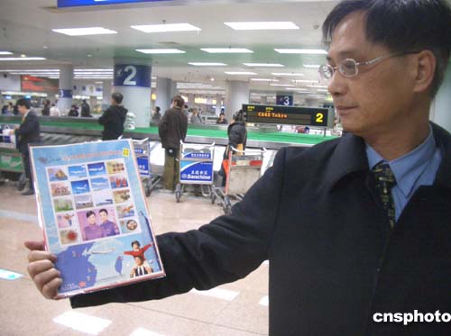 二00五年臺商春節(jié)包機(jī)二十九日首次實現(xiàn)兩岸雙向?qū)︼w,臺灣首班飛抵北京的華航CI581班機(jī)于十一點五十八分到達(dá)北京首都機(jī)場,華航為此特發(fā)行紀(jì)念郵票一套,并在飛機(jī)上贈送給旅客。作者:路梅