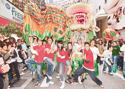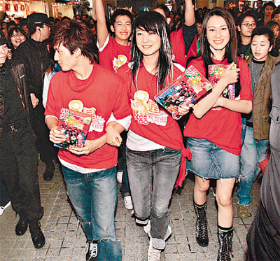 雖然Twins身在臺(tái)灣而缺席,但英皇五星的出現(xiàn)同樣哄動(dòng),加上打鑼打鼓的舞龍儀式,令現(xiàn)場(chǎng)氣氛推至高潮!熱情的歌迷重重包圍,令五星寸步難行。當(dāng)開始派發(fā)揮春時(shí),歌迷瘋狂上前搶奪,場(chǎng)面一發(fā)不可收拾,為顧及安全,沒(méi)到兩分鐘,五星就連忙登車離去。身穿迷你短裙的Isabella,活動(dòng)未開始前,還表示不擔(dān)心混亂中被摸,但當(dāng)她被擠在人群當(dāng)中,不禁表現(xiàn)驚慌,一直雙手護(hù)胸。而Yumiko則由Boy'z的Kenny保護(hù),最后五星在保安開路下離開,此時(shí)才可以輕松地向Fans揮手道別。