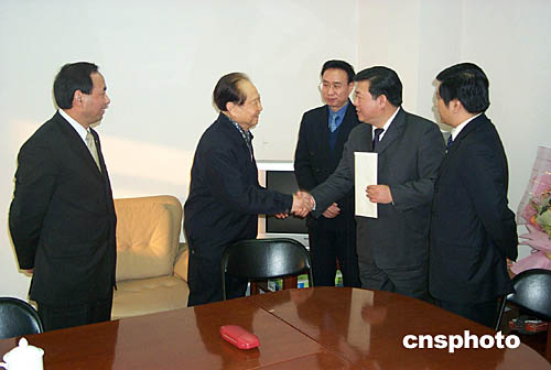 海協(xié)會長汪道涵在上海親筆書信致辜振甫家屬,委托即將赴臺參加辜振甫追思會的汪老個人代表孫亞夫(右)和李亞飛轉(zhuǎn)交。作者:葛鳳章