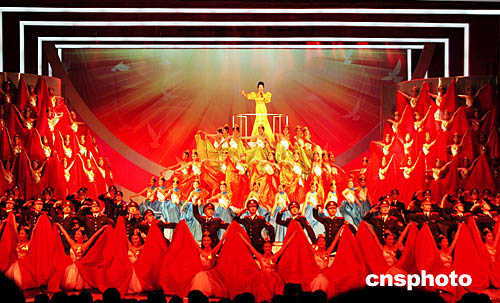 由七百多名解放軍及武警官兵參演的2005年軍民迎新春文藝晚會《春綠大地情滿懷》,二月二日晚在北京中國劇院舉行。中國國家主席胡錦濤、吳邦國、溫家寶等國家領(lǐng)導(dǎo)人與首都軍民歡聚一堂,共賀新春。圖為解放軍總政治部歌舞團(tuán)大牌演員彭麗媛的壓軸節(jié)目《高歌向明天》的表演。中新社記者:王麗南