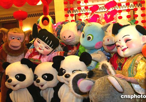 走進(jìn)張燈結(jié)彩的人民大會(huì)堂,噴泉涌動(dòng),鮮花爭(zhēng)艷,迎面兩個(gè)賀歲的“阿福”擁著“壽星”向人們恭賀新喜,彩燈閃爍的“!弊直磉_(dá)著新春的祝福。大型充氣“雞型”、“龍型”滑梯和“燈籠”、“蘑菇”城堡成了孩子們的樂(lè)園。