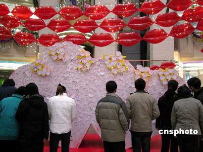情人節(jié)前夕,錫城市場上的各種情人應節(jié)禮品、紅色玫瑰等受到年青人的追捧。無錫一些商家推出的許愿墻上許心愿活動異常火爆,對對情侶紛紛買來許愿牌、同心結(jié),寫上祝福貼在各種“心”形墻上,希望能將情意綿綿的情話捎給心愛的人。作者:潘正光