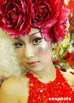 情人節(jié)到來之際,北京商家以各種不同的形式推出多種促銷活動,圖為一家色彩藝術(shù)公司在推出情人節(jié)禮盒活動時,彩妝模特配戴玫瑰花吸引顧客。作者:錢興強
