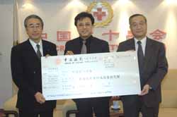 二月二十二日,中國日本商會和北京日本人會向中國紅士字會捐款二十六萬余元人民幣,支援“印度洋海嘯”后重建資金。圖為中國紅十字會副會長郭長江(中)接受中國日本商會會長武田勝年(右)等捐款。作者:張宇