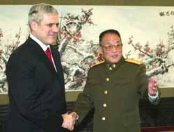 中國國防部長曹剛川二月二十二日在北京會見塞爾維亞和黑山的塞爾維亞共和國總統(tǒng)鮑里斯·塔迪奇。作者:滿會喬