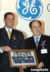 通用電氣副總裁孫禮達(左)接受中國奧委會副主席肖天贈送的禮物
