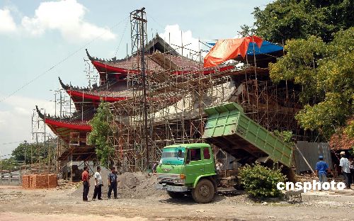 為紀念鄭和七下西洋六百周年,印尼三寶壟正在新建一座新的三寶公廟,面積三千五百平方米,廟宇寬大,氣宇軒昂,廟后鄭和七下西洋巨幅壁雕,人物逼真,氣勢磅礴。記者:蔣振江