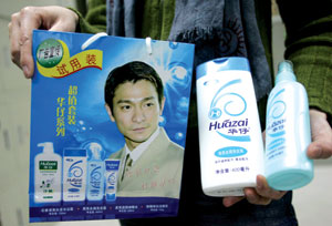 記者見到,在“華仔系列”超級套裝的宣傳紙袋以及該公司出品的“黑亮去屑洗發(fā)露”的包裝盒以及宣傳單上,印有劉德華面帶微笑、穿著米黃西裝的半身像。據(jù)調(diào)查,印有劉德華形象的各類洗滌化妝用品的出廠價格低得驚人。一罐1130毫升沐浴露出廠價僅為3.5元,而在市場上卻達35元以上。