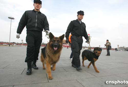 圖:警犬在天安門執(zhí)行安全檢查