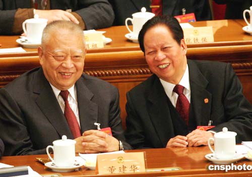 三月三日下午,全國(guó)政協(xié)十屆三次會(huì)議在北京人民大會(huì)堂開(kāi)幕,香港特首董建華作為新增補(bǔ)的政協(xié)委員出席了本次會(huì)議。圖為董建華在主席臺(tái)上與最高法院院長(zhǎng)肖揚(yáng)交談。作者:湯彥俊
