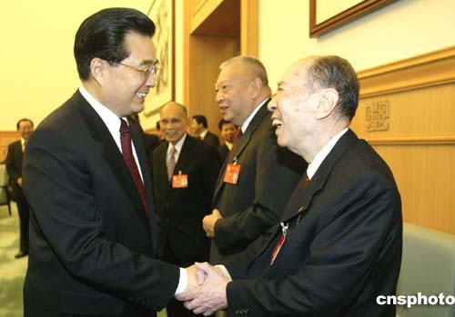 全國(guó)政協(xié)十屆三次會(huì)議三月三日在北京開(kāi)幕,國(guó)家主席胡錦濤在開(kāi)幕式前問(wèn)候出席會(huì)議的全國(guó)政協(xié)副主席馬萬(wàn)祺。作者:廖文靜