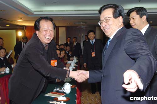 三月四日,中共中央政治局常委、國(guó)家副主席曾慶紅到北京華潤(rùn)飯店參加全國(guó)政協(xié)民進(jìn)、民盟聯(lián)組會(huì)議時(shí),應(yīng)著名導(dǎo)演李前寬的要求與其握手。作者:陳文