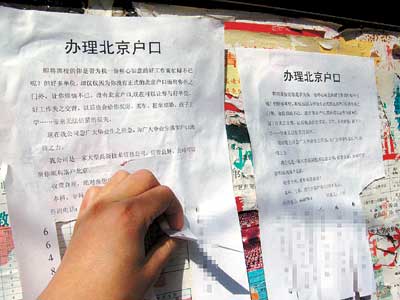 中新網(wǎng)3月7日電 北京娛樂信報報道,昨日上午,近20張為畢業(yè)生“辦理北京戶口”的小廣告,密密麻麻地貼在北京林業(yè)大學(xué)的宣傳欄上,上寫“為廣大畢業(yè)生落實(shí)戶口助一臂之力……本科、?啤⒀芯可鋺艟豁5萬元!