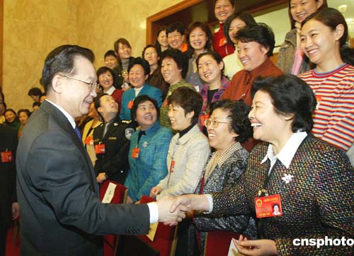 國(guó)務(wù)院總理溫家寶三月七日到全國(guó)人大江蘇代表團(tuán)與代表們一起審議政府工作報(bào)告。因三八節(jié)即將到來(lái),溫家寶在會(huì)后特意與江蘇團(tuán)所有女代表合影留念。作者:廖文靜