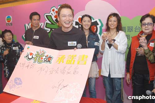 無線電視劇《心花放》3月9日在香港舉行慶祝收視祝捷會(huì),影視紅星陶大宇在祝捷會(huì)寫下承諾書:若該劇收視平均高達(dá)35點(diǎn),將自掏腰包宴請(qǐng)臺(tái)前幕后。作者:鄧慶樂