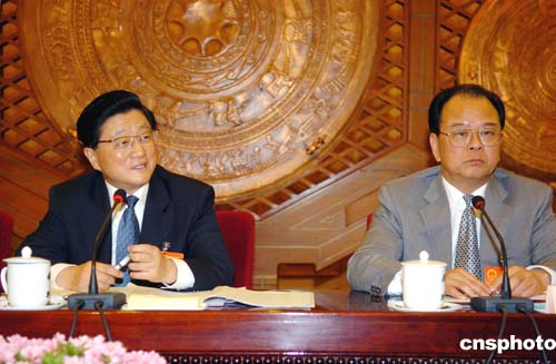 中共中央政治局常委黃菊三月九日與出席十屆全國(guó)人大三次會(huì)議的廣西代表一起審議全國(guó)人大常委會(huì)工作報(bào)告和“兩高”報(bào)告。作者:陳文