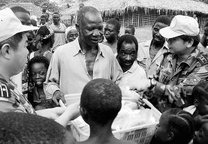利比里亞地處西非,原是一個美麗富饒的國度。然而,長達(dá)14年的內(nèi)戰(zhàn),使這個苦難的國家政局動蕩、戰(zhàn)亂困擾、經(jīng)濟近乎崩潰。2003年11月,奉國務(wù)院、中央軍委命令,以福州總醫(yī)院醫(yī)務(wù)人員為主體組建的南京軍區(qū)首支赴利比里亞維和醫(yī)療分隊成立。這支包括32名男隊員和11名女隊員的醫(yī)療分隊,有外科、內(nèi)科、眼科、牙科以及麻醉、藥劑、檢驗、放射醫(yī)師和重癥監(jiān)護(hù)護(hù)士、手術(shù)護(hù)士、衛(wèi)生員,還有駕駛員、通信技師、水電工、廚師等保障人員。